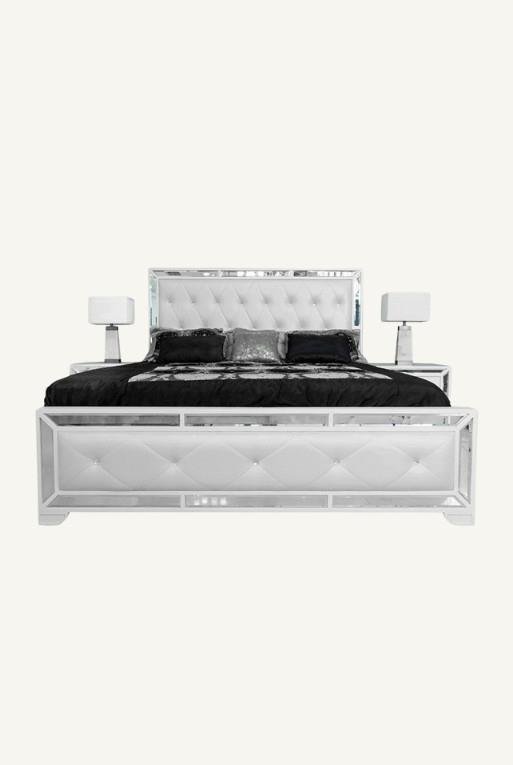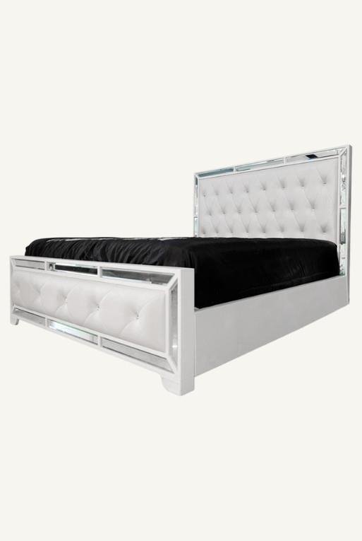Cama fabricada en mdf, con madera poplar. Destaca por sus detalles en terminado espejo. Su cabecera está tapizada con tacto-piel de alta calidad, color perla.