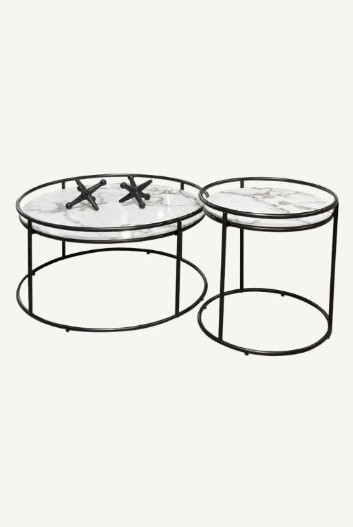 Mesa de centro hecha con acero inoxidable color negro y cubierta de cerámica tipo mármoil blanco.