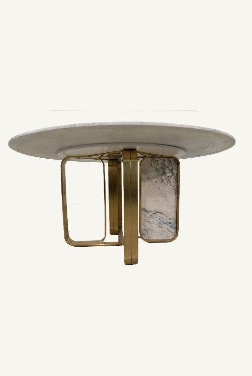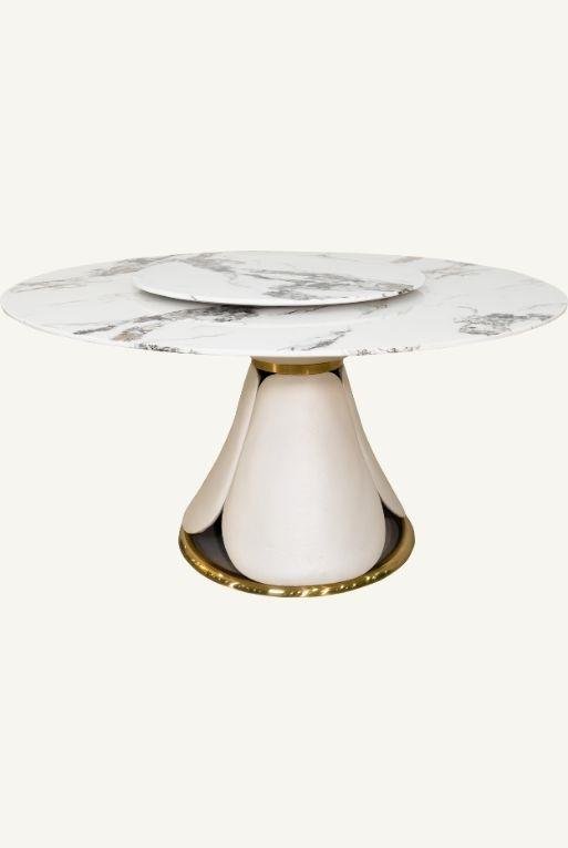 Mesa de comedor de cerámica acabado tipo mármol, con lazy susan integrado y base de acero inoxidable forrada con tacto piel y acentos dorados.
