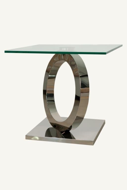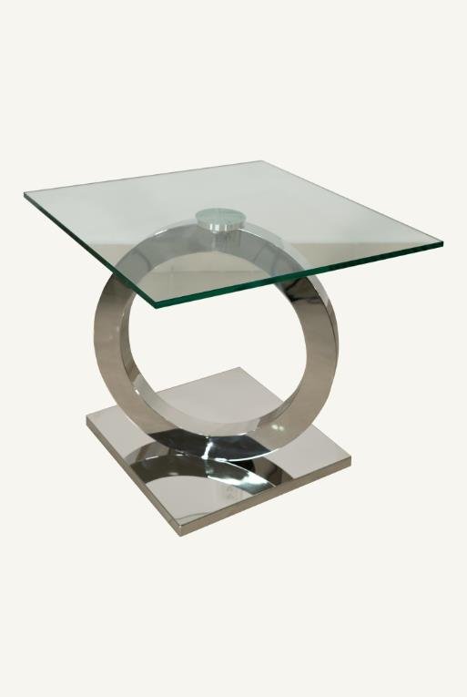 Mesa lateral con cubierta de cristal templado y base de acero inoxidable. Diseño moderno y elegante que complementa cualquier sala de estar.