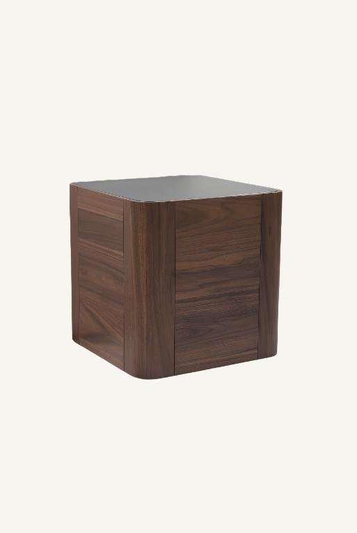 La mesa lateral Hanna está hecha con madera de nogal y cuenta con una cubierta de cristal templado ahumado. Sus bordes curvos añaden un toque suave al diseño funcional, perfecta para cualquier espacio.