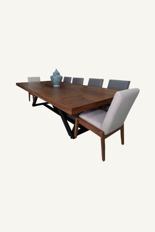 Mesa de comedor hecha con parota y base de metal reforzado color negro.