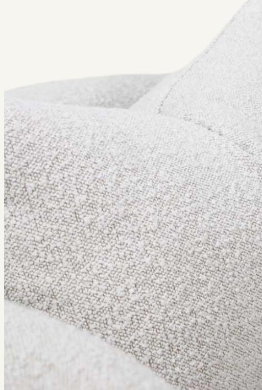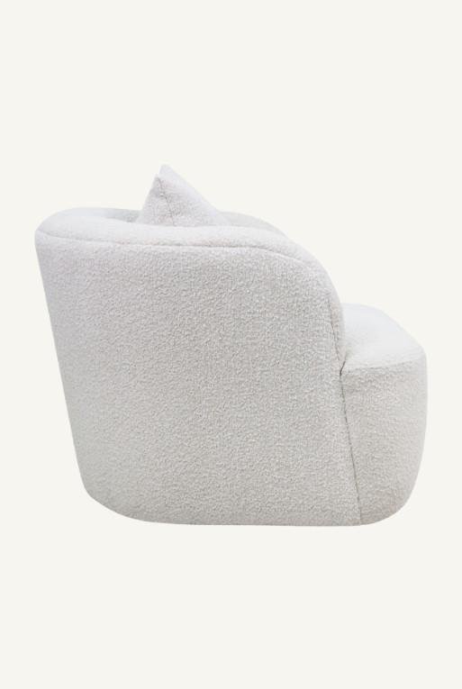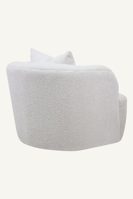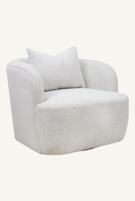 Sillón ocasional hecho con tela tipo bouclé color blanco giratorio.